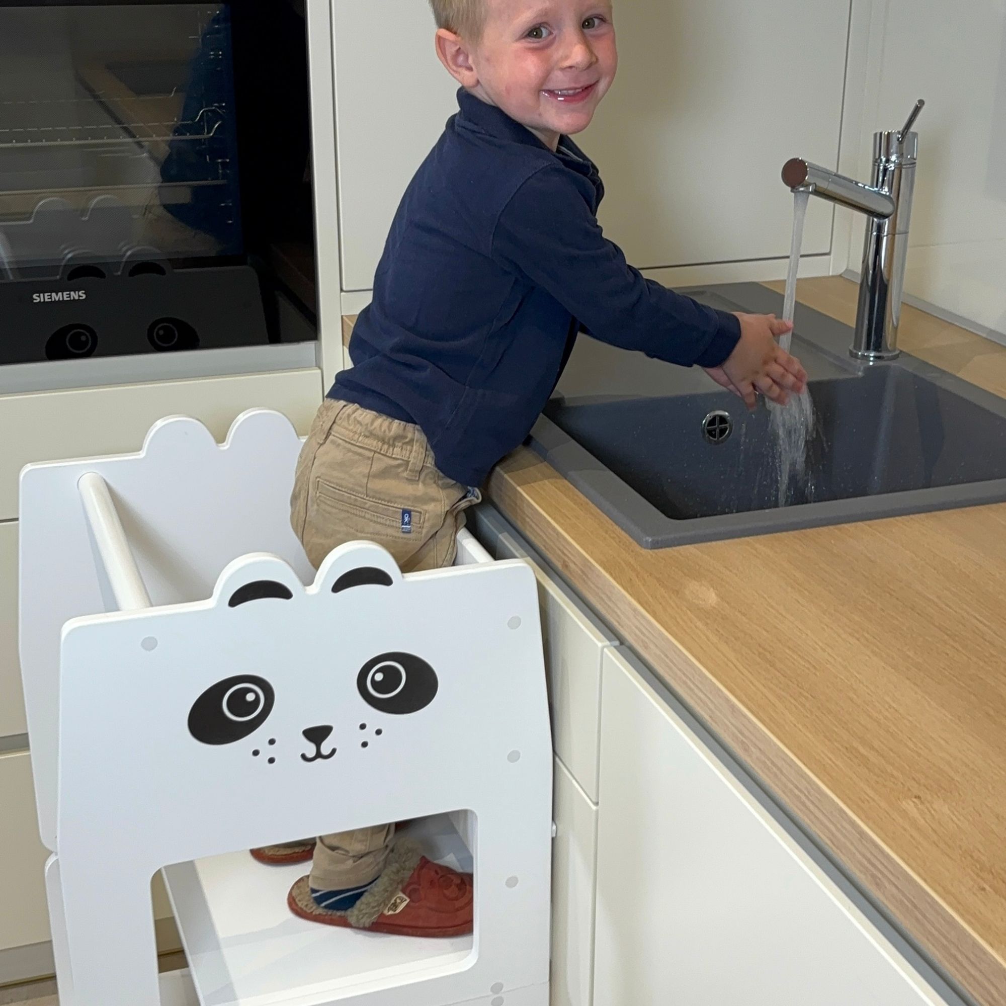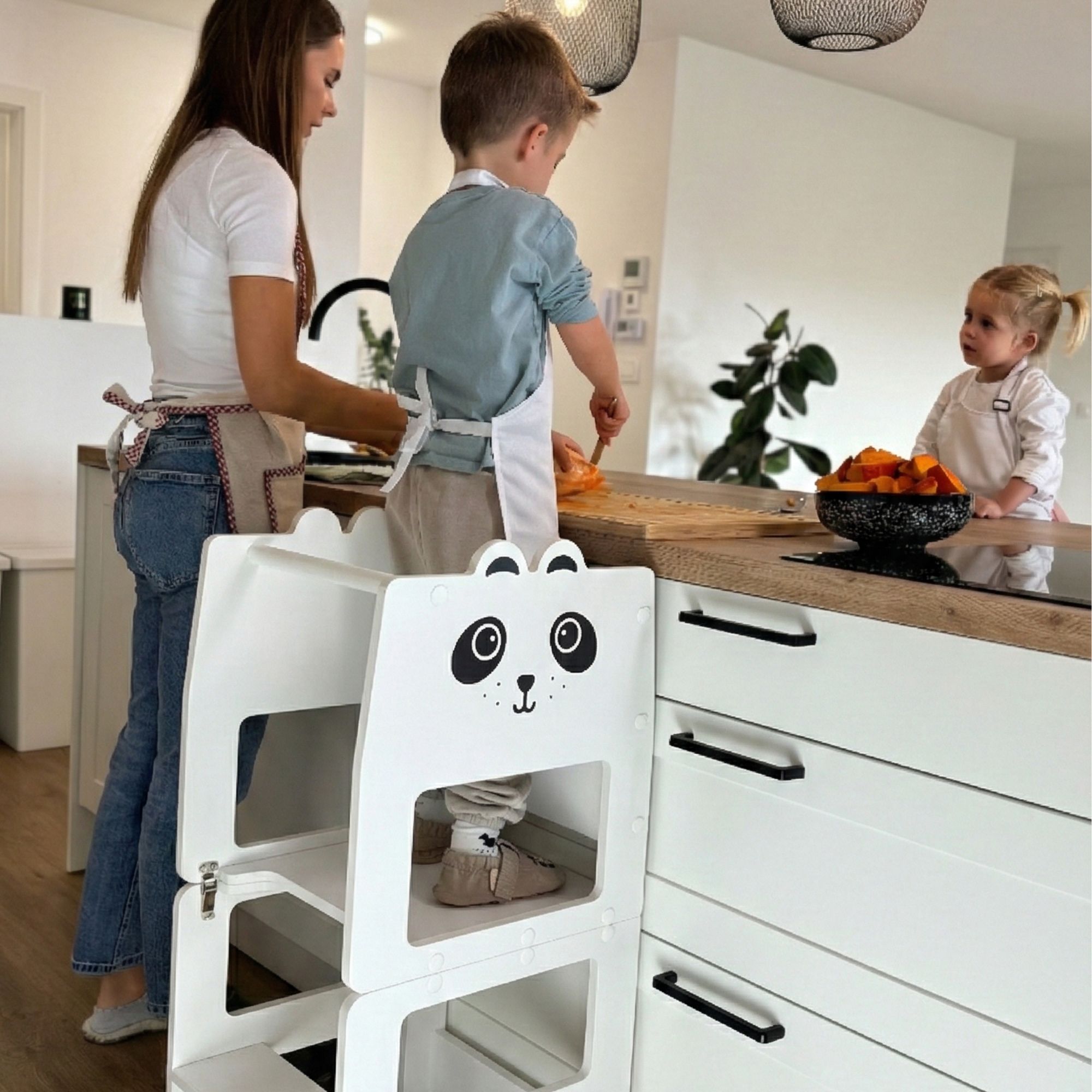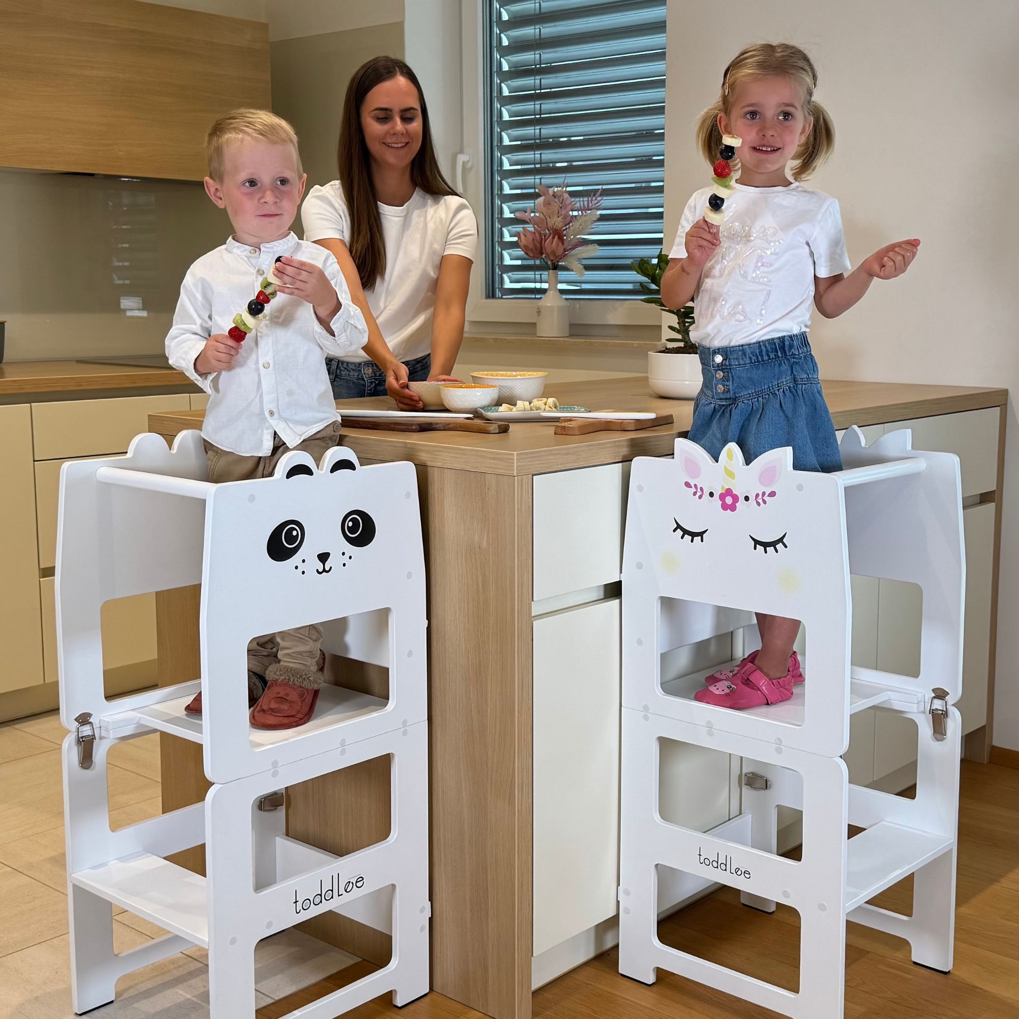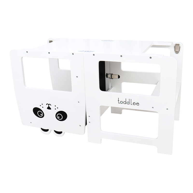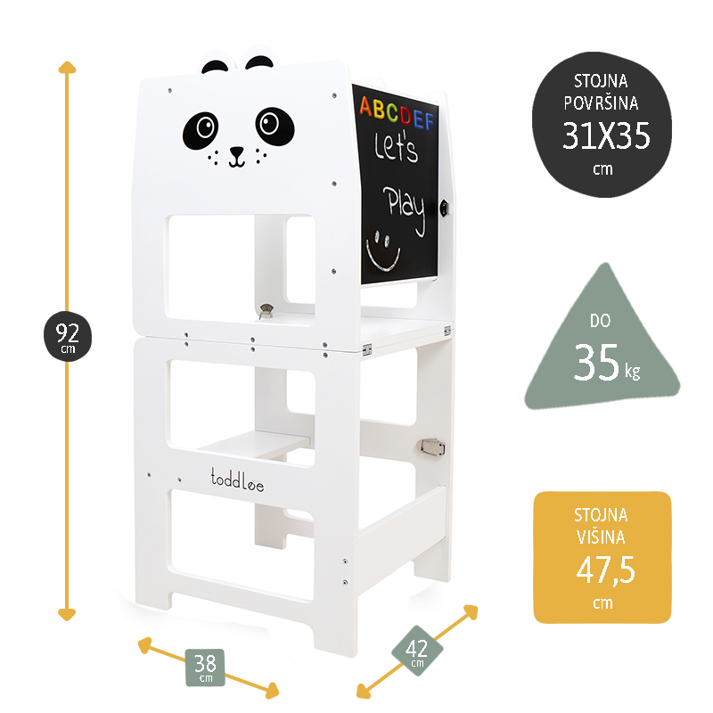 Pomagalček Toddlee Panda bo pripomogel k vključevanju vašega malčka v vsakodnevne dejavnosti. Pomagalček otrokom omogoča varno doseči višje površine, kot je npr. kuhinjski pult. Poleg tega ga je mogoče zelo enostavno spremeniti v mizo s stolčkom za igranje, risanje in druge dejavnosti. Učni stolp Toddlee Panda vključuje tudi zelo priljubljeno leseno magnetno tablo za risanje s kredami, ki jo otroci obožujejo. Služi lahko za učenje risanja in kasneje za pisanje ali pa igro vlog in prosto igro. Pomagalček je zasnovan tako, da ustreza različnim potrebam majhnih otrok.